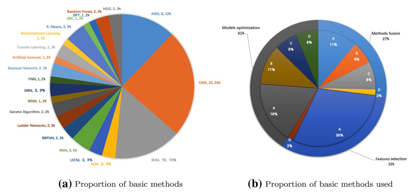 其中,24%的方法使用了卷積神經網絡(CNN),15%的方法使用了支持向量機(SVM),12%的方法使用了人工神經網絡(ANN)