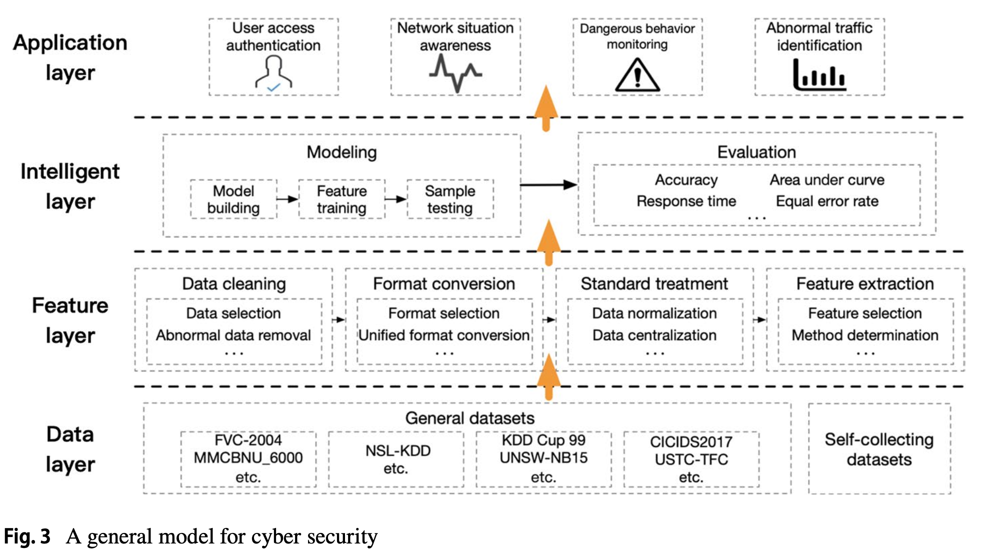論文回顧了集中在四個網路安全領域的AI應用文章,即用戶訪問認證、網路態勢感知、危險行為監測和異常流量識別。