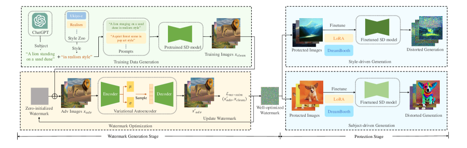 - 創新點:通過干擾 VAE,使水印在不改變 SD 模型權重的情況下有效破壞圖像生成過程。