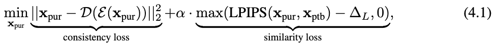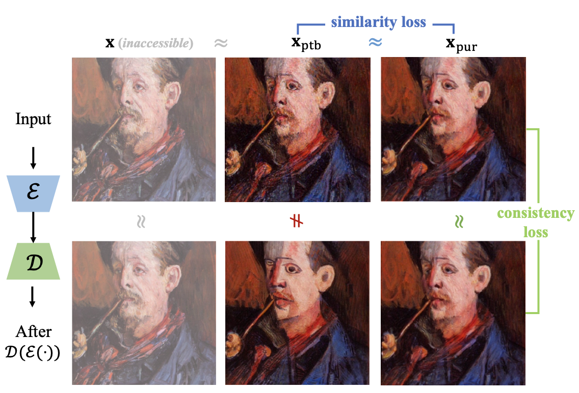 目的:確保淨化後的圖像 (xpur) 經過編碼器 (ℰ) 和解碼器 (𝒟) 重建後,仍然與自身保持一致。