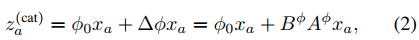 za(cat) = 這是最終的輸出。它等於「原始的扭曲結果」(ϕ0xa) 加上 「Adapter 計算出的修正量」(Δϕxa)。