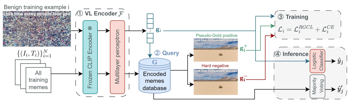 → 論文發現HateCLIPper等現有模型將相反標籤的混淆梗圖映射到embedding space的相似位置,導致分類錯誤。