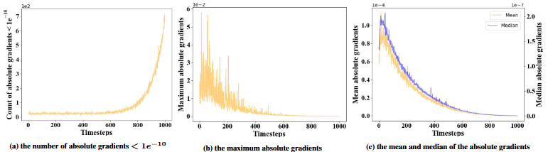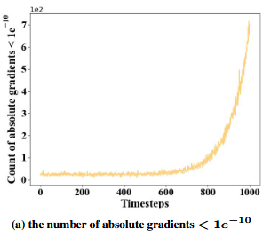 設置了一個閾值,用於評估在不同時間步的擾動圖像中,絕對值低於該閾值的梯度數量。在總時間間隔 (0, MaxTrainStep) 的後期,絕對梯度低於指定閾值的數量急劇增加。