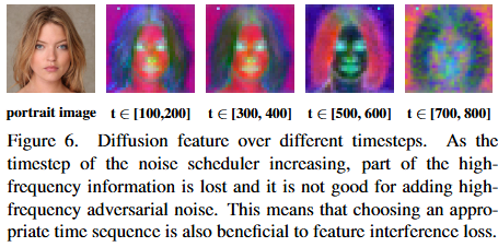 - 當時間步較大時,由於重建圖像和原始圖像的主要差異集中在低頻成分,擾動圖像的梯度接近於零,導致對抗噪聲的優化效果變差。
